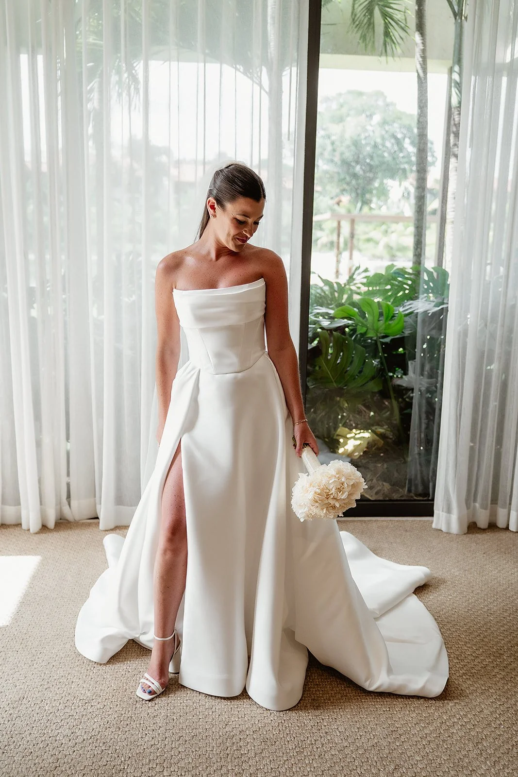 Maddy embodied effortless beauty, seamlessly blending classic bridal elegance with a touch of island ease. Her gown paired with white pumps and a subtle pop of blue on her nails, a small yet striking detail. Her look felt intentional yet effortless, a true reflection of her style.